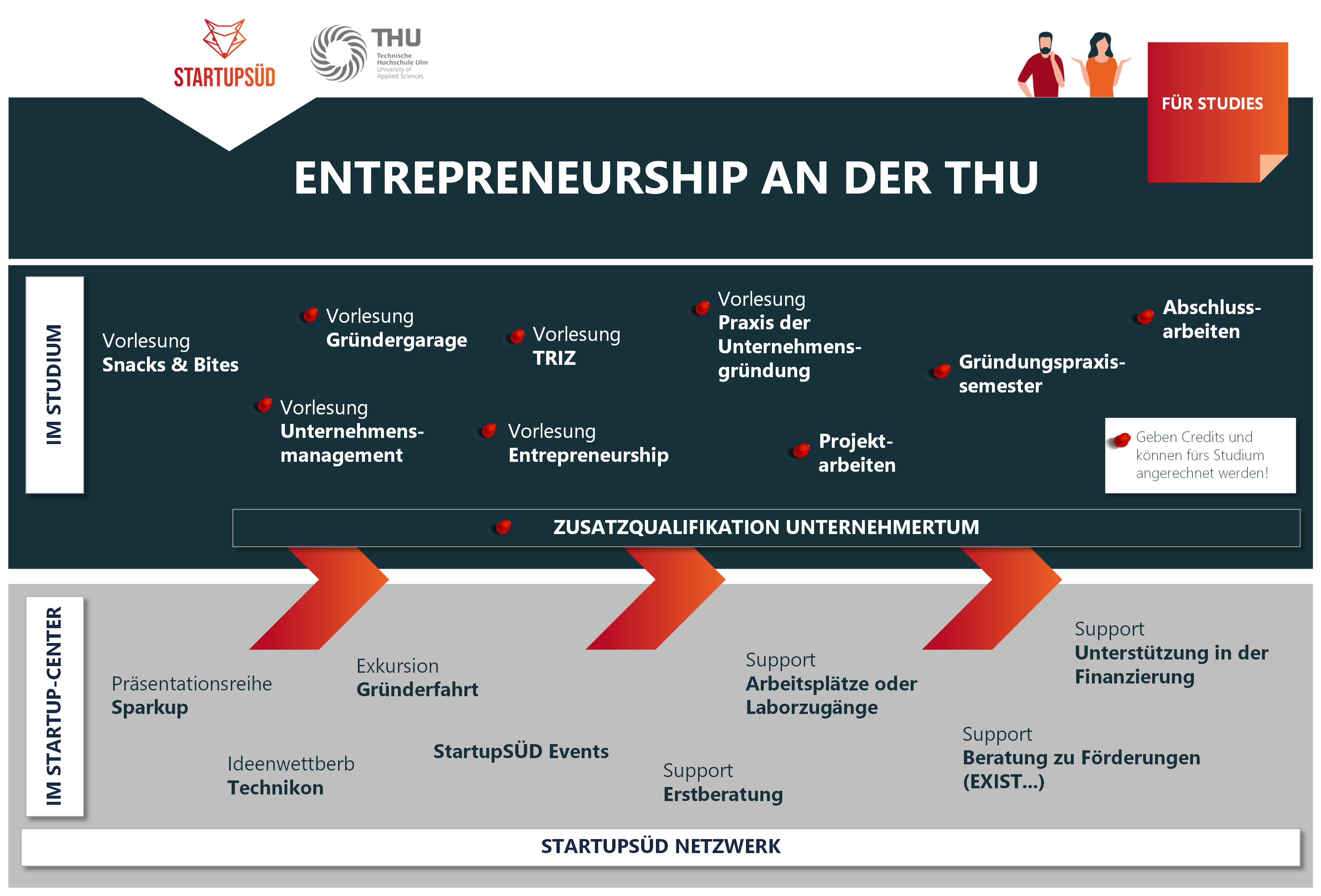 Die THU und das THU-Startup Center haben für Sie ein breites und innovatives Bildungsangebot im Bereich Entrepreneurship und Förderung des Unternehmergeists entwickelt. Aus der unten stehenden Roadmap können Sie entnehmen, welche Lehr- und Weiterbildungsangebote wir für Sie passend entwickelt haben. Sprechen Sie uns an, wir helfen Ihnen gerne weiter.