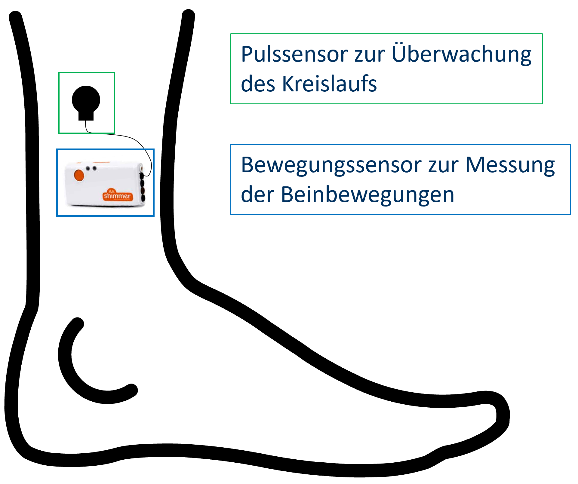 Bewegungssensor: hiermit werden die RLS-typischen Bewegungen an der relevanten Extremität (in der Regel am Beim bzw. Fuß)